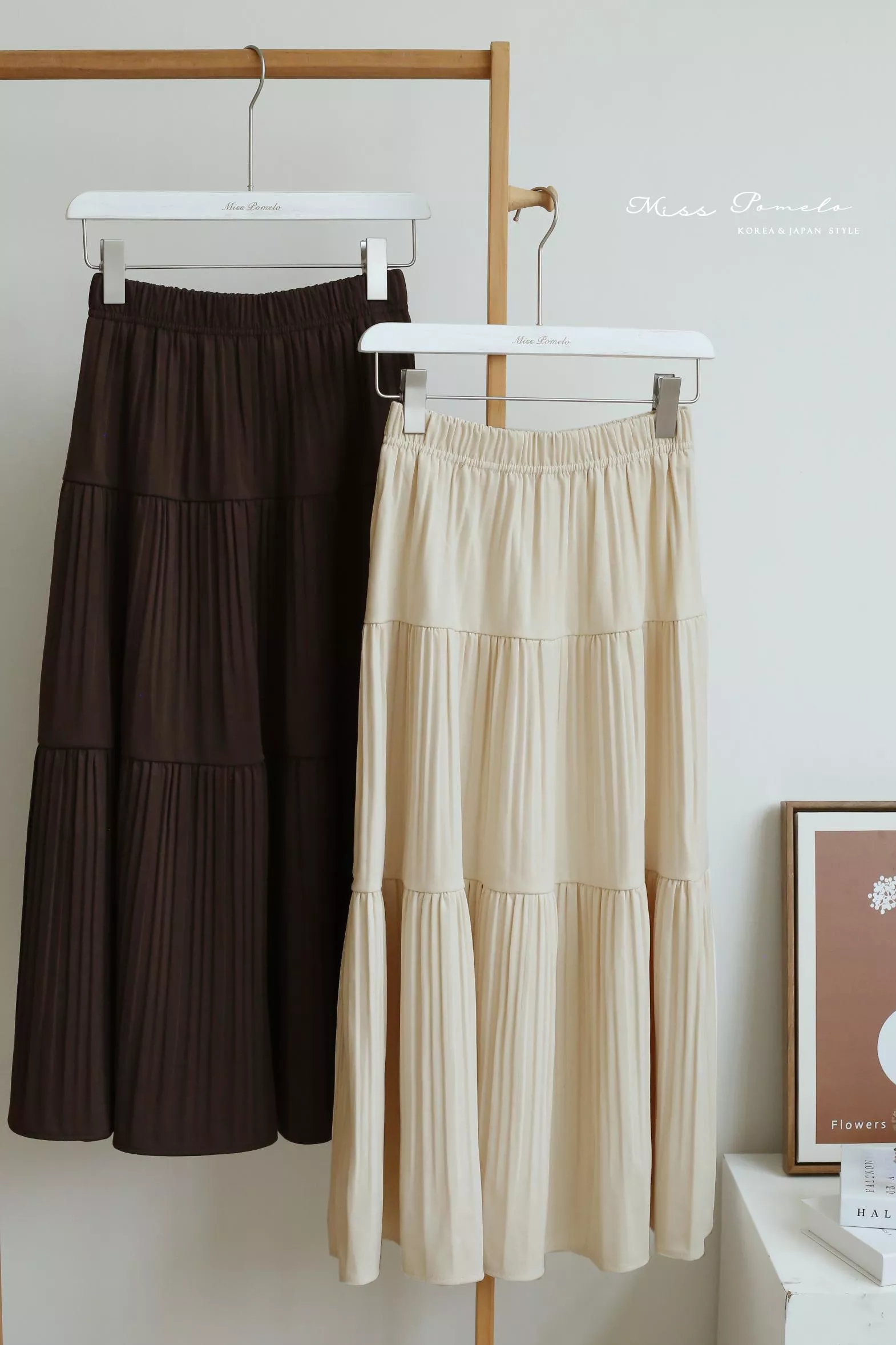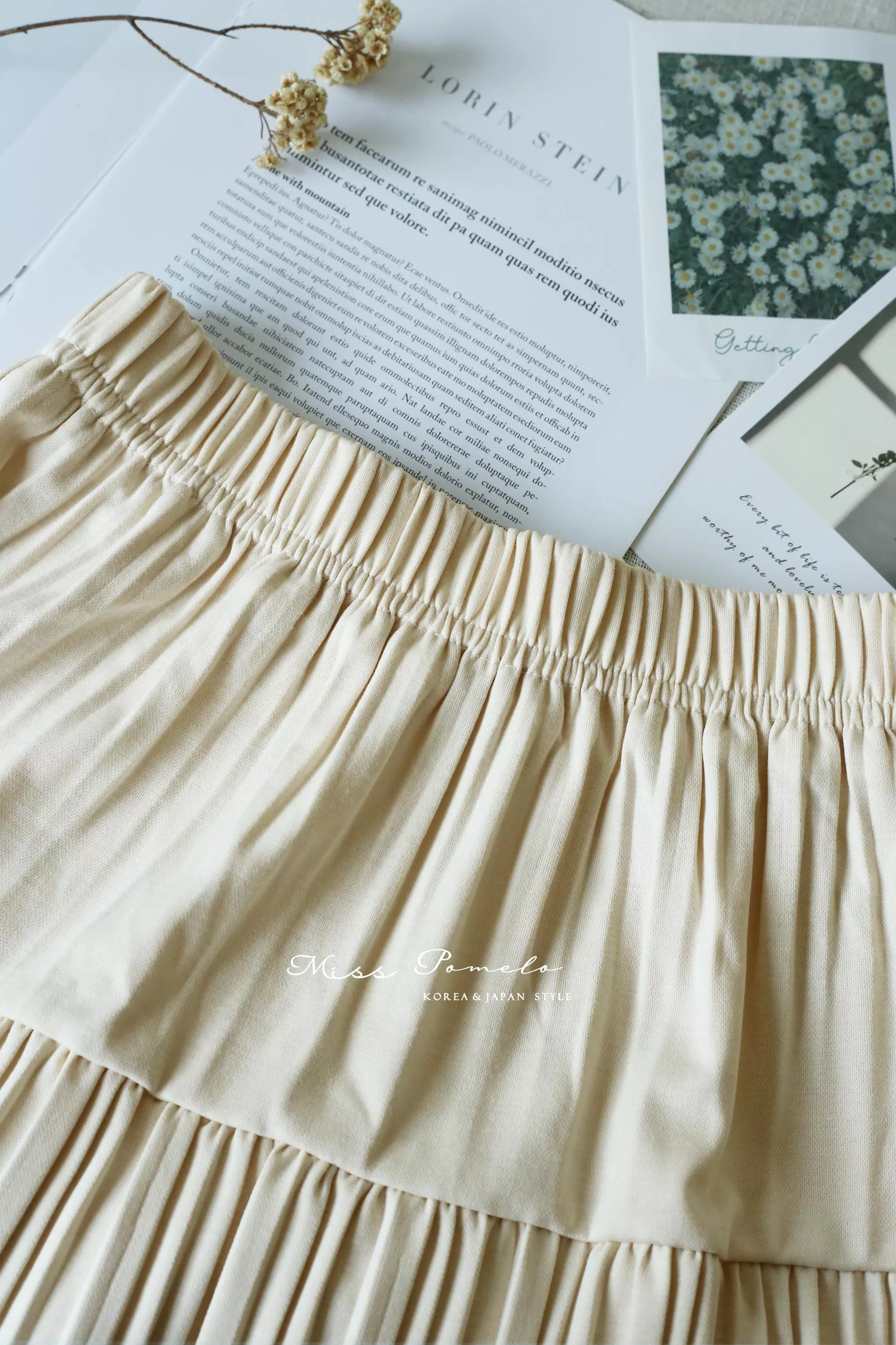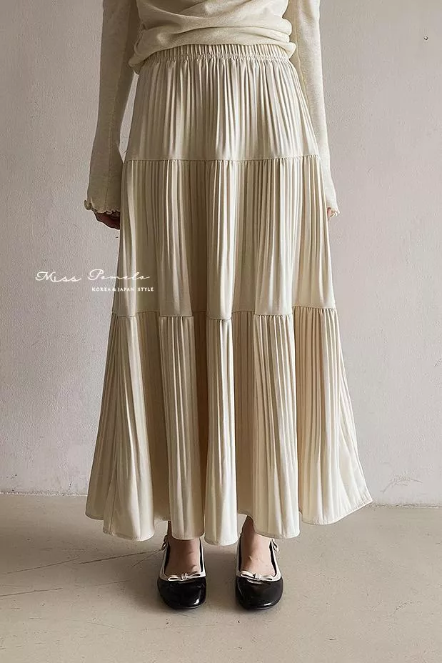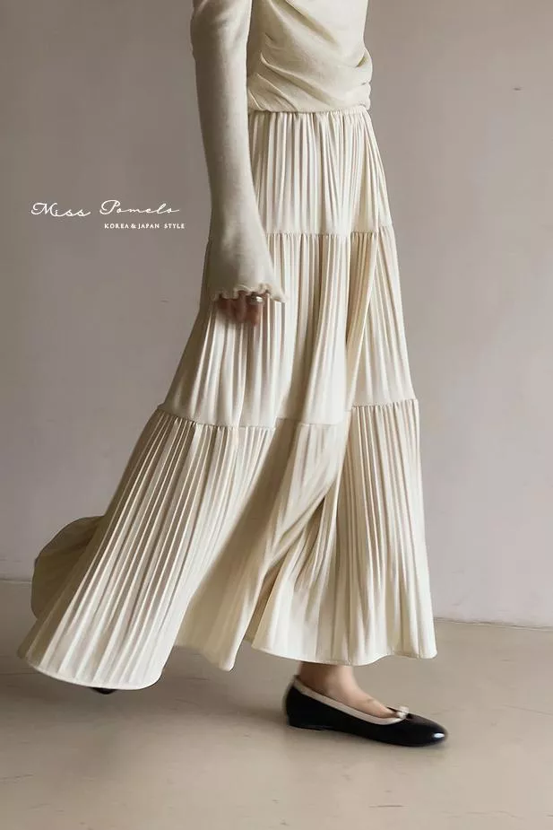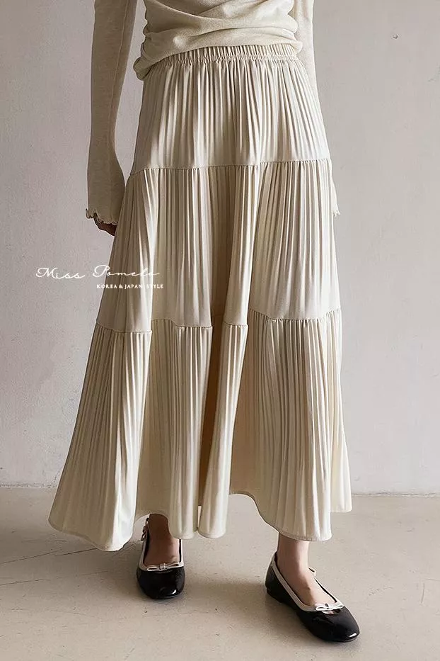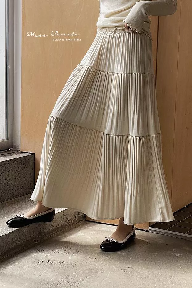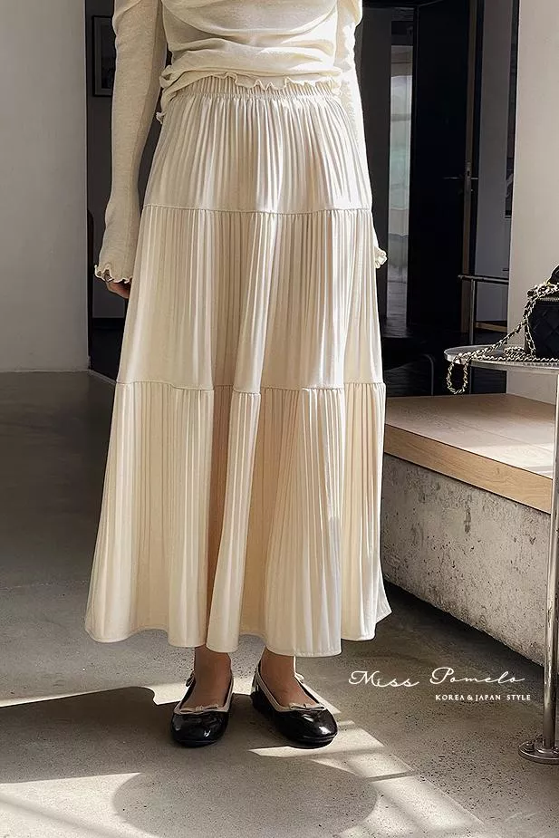 全鬆緊腰設計貼合腰線,層層壓褶的裙身展開如花,