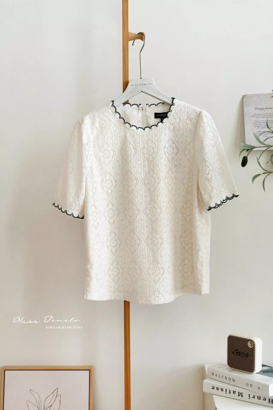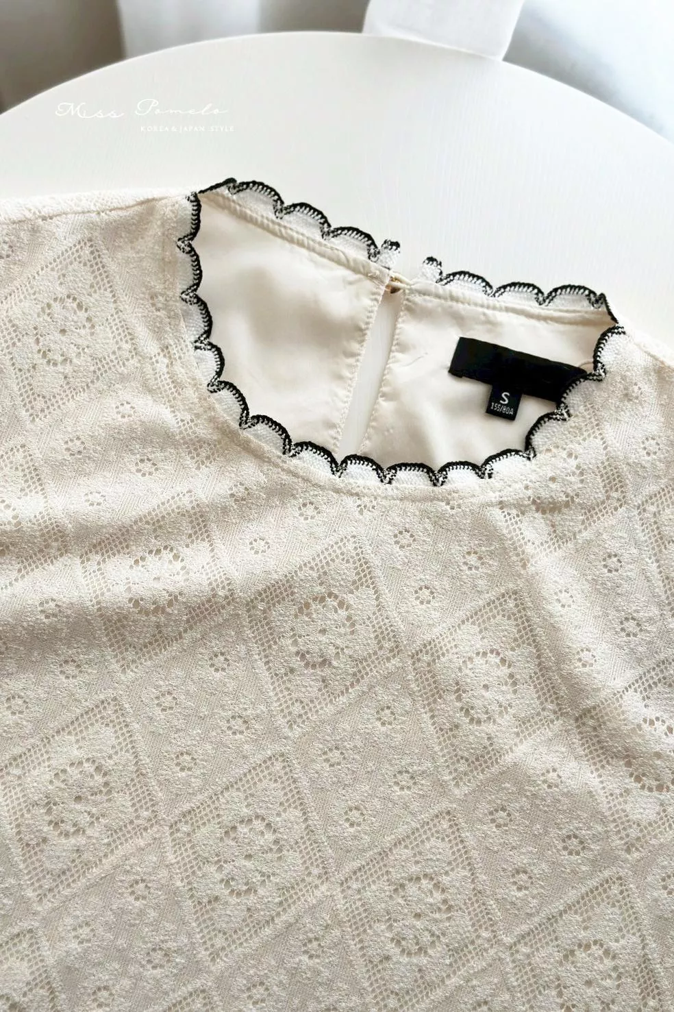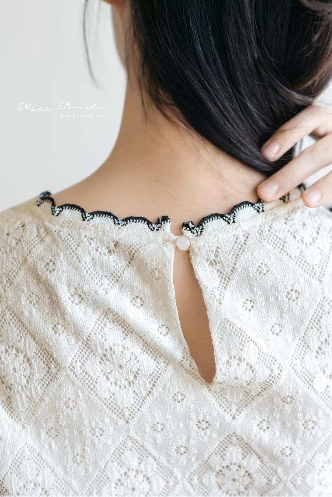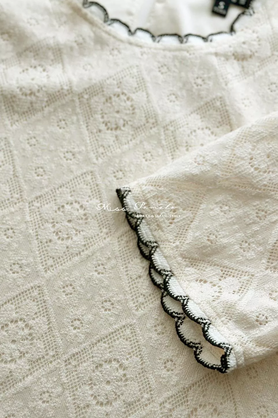 ● 圓領設計柔美包覆,領口與袖口特別加上波浪狀墨黑撞色滾邊,在奶霜白基底上展現精緻的復古對比感。