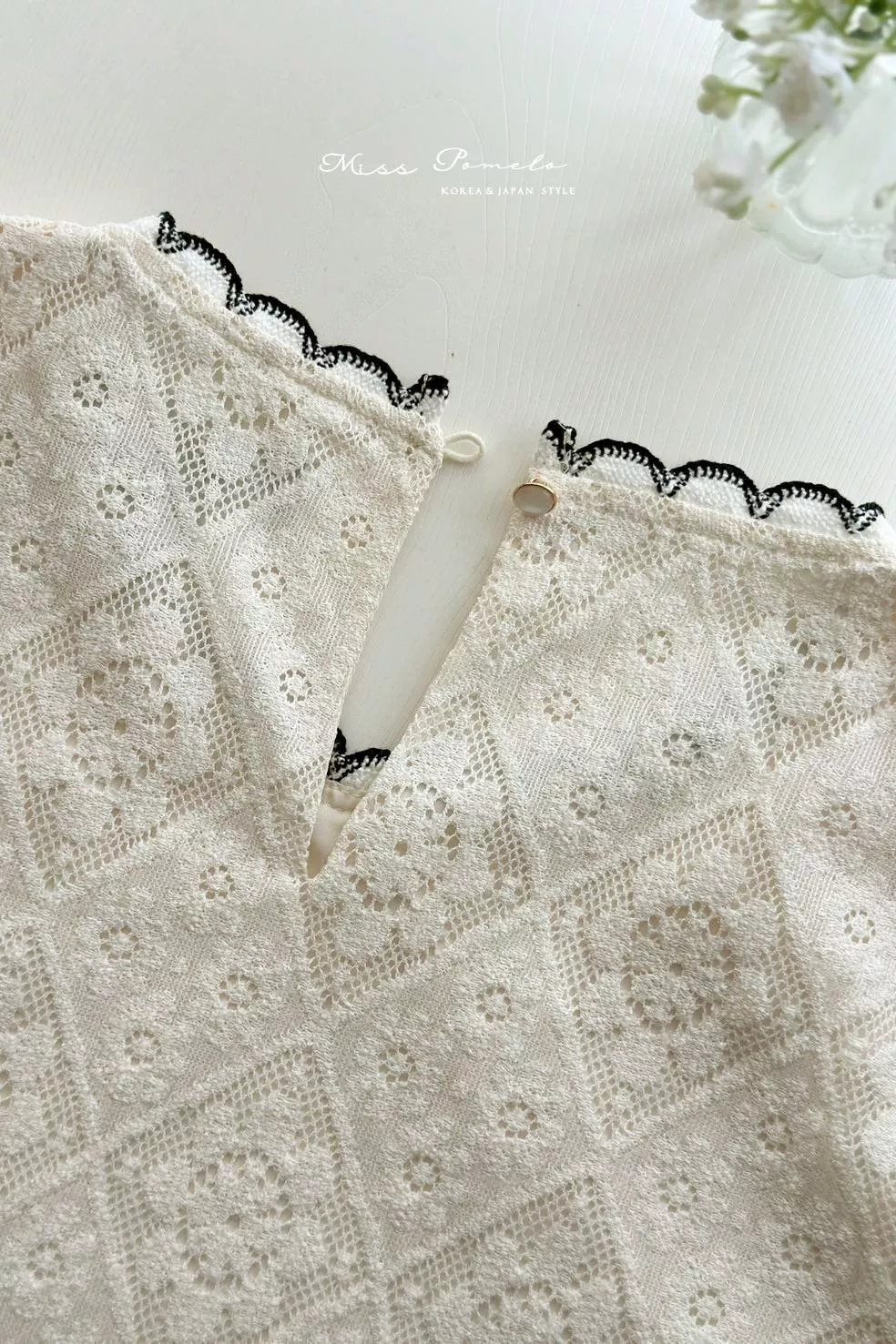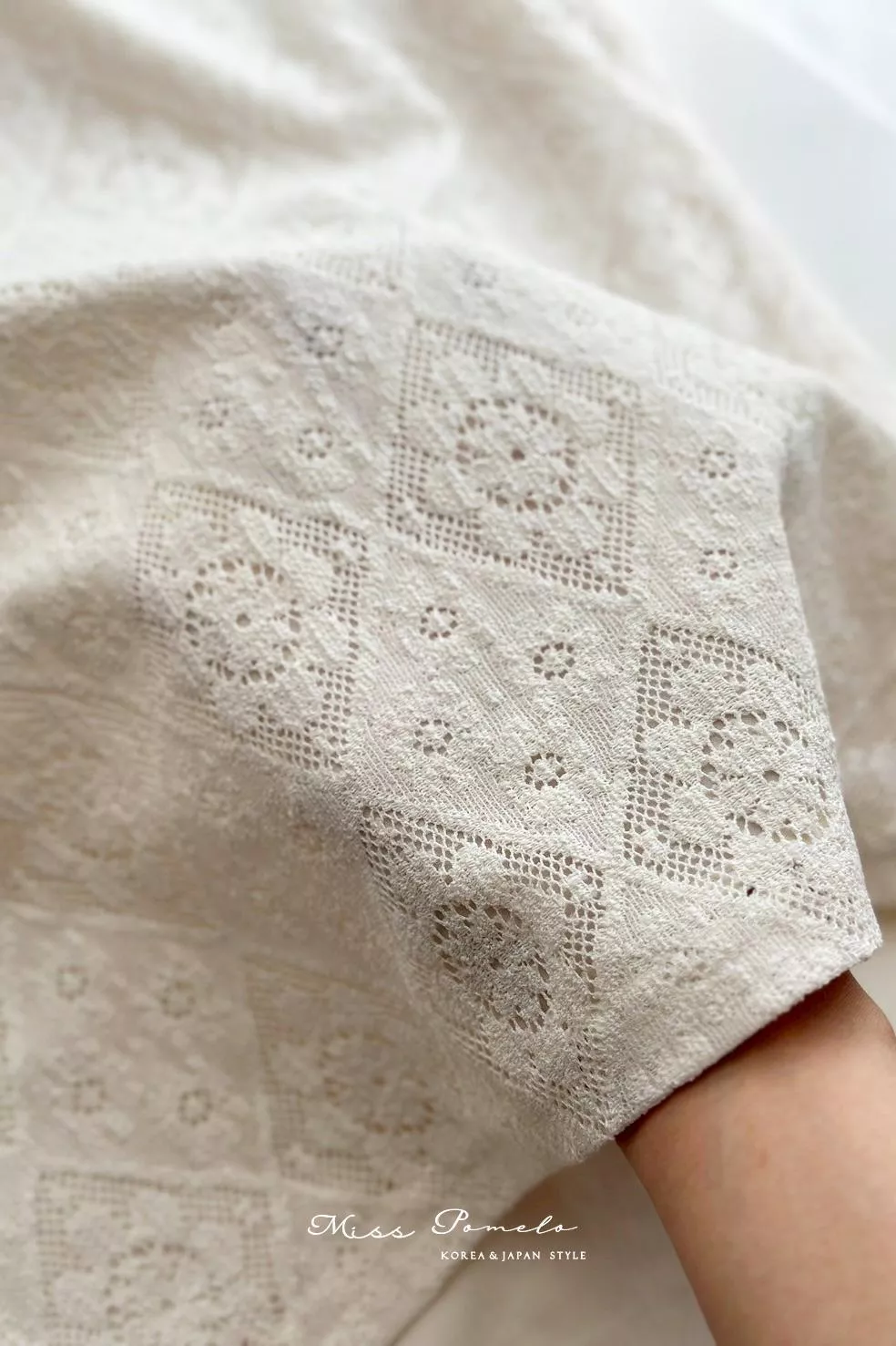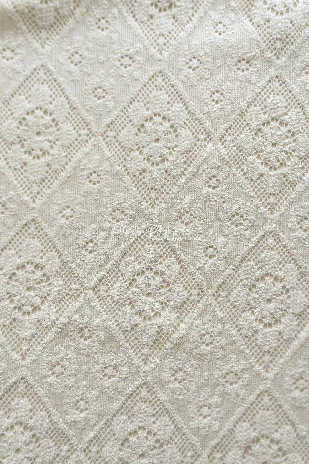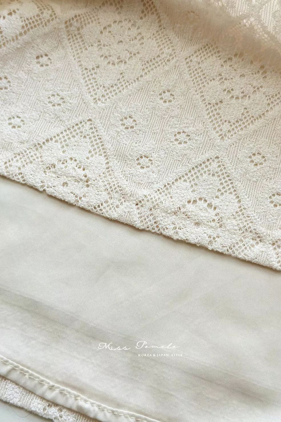 · 面料為輕柔蕾絲提花,圖案為連續性的菱格紋+花瓣圓點交織鏤空。