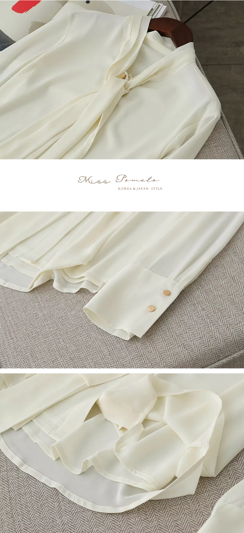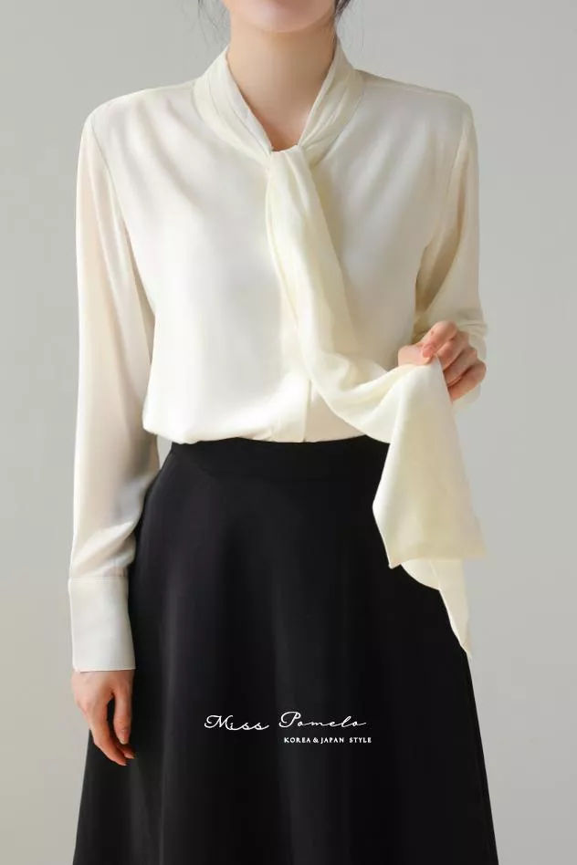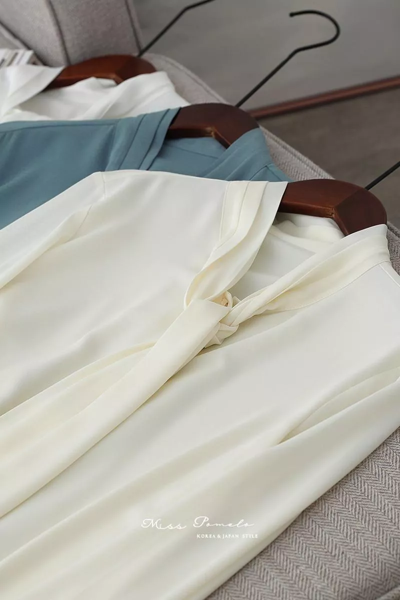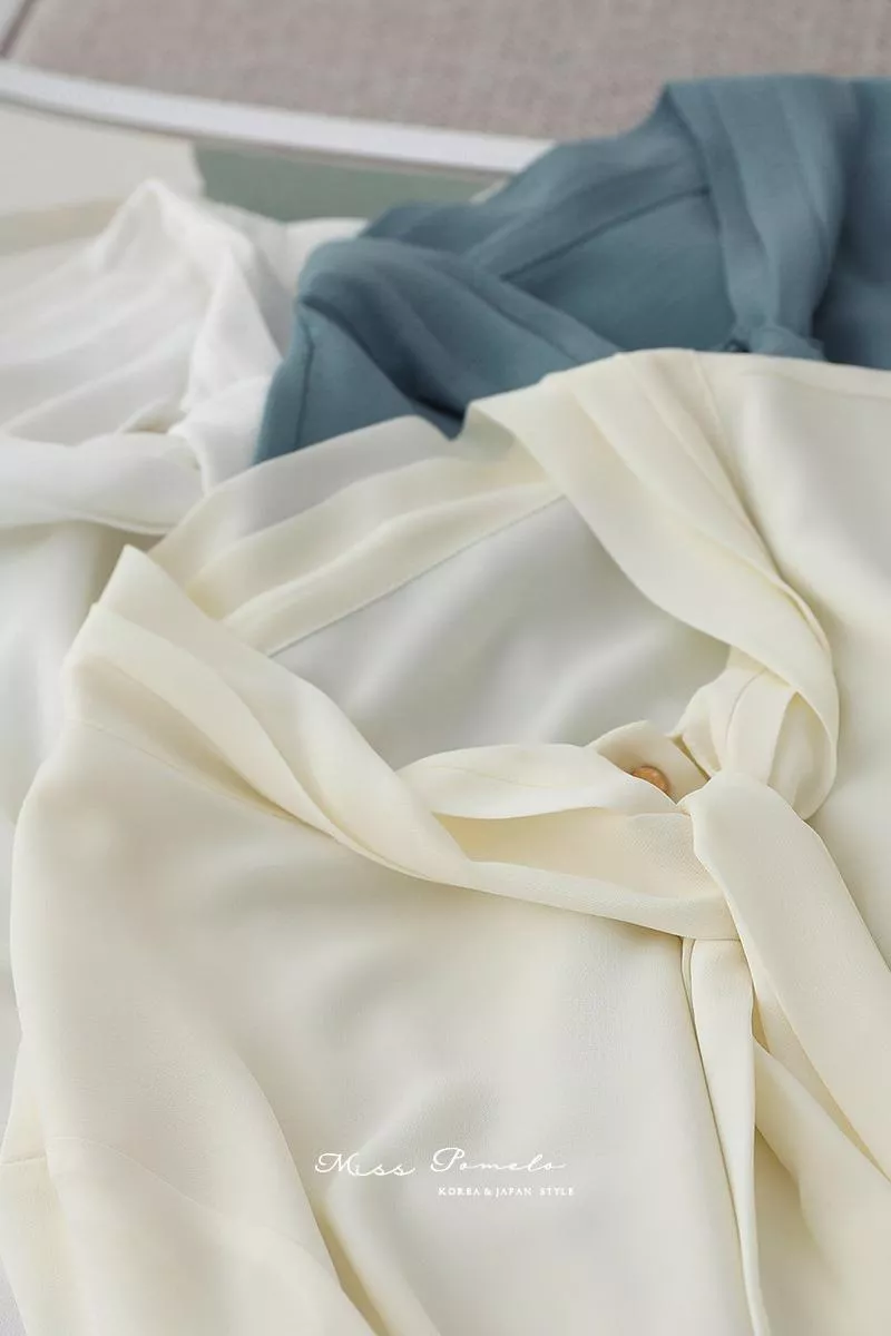 ● 領部以壓摺工藝細膩收邊,順延成柔長綁帶,可依心情繫成蝴蝶結或隨性垂落;