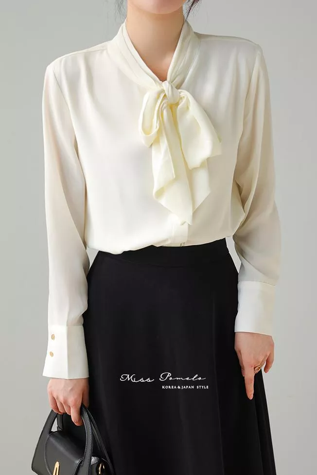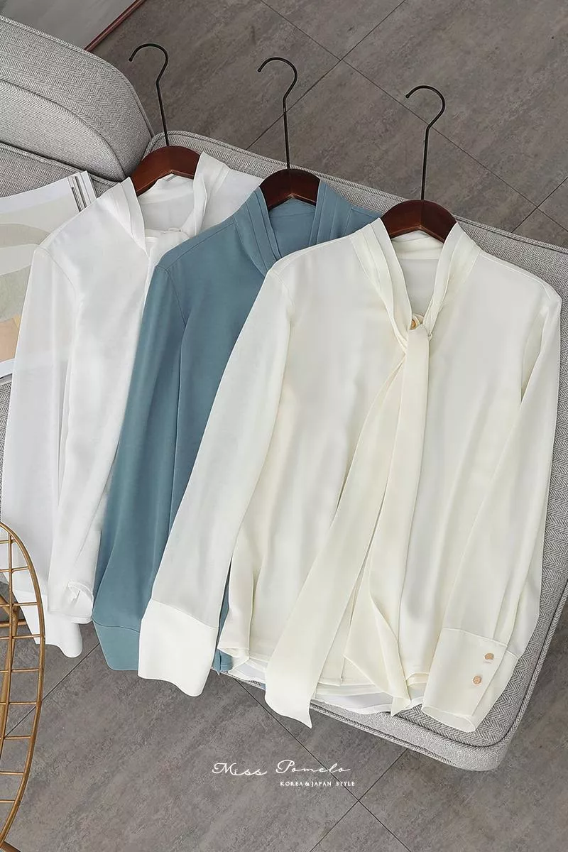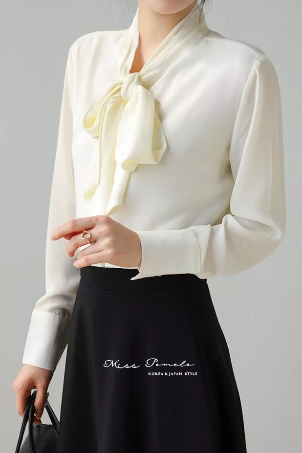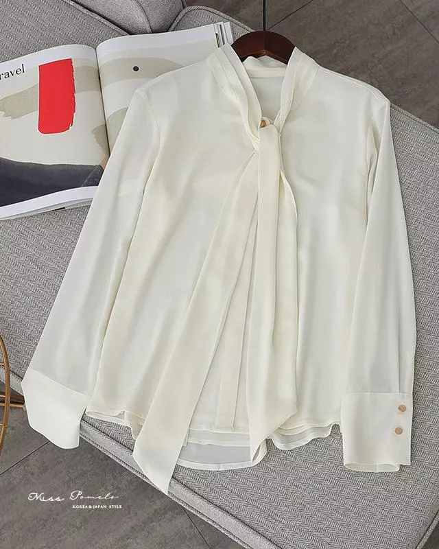 ● 領部以壓摺工藝細膩收邊,順延成柔長綁帶,可依心情繫成蝴蝶結或隨性垂落;