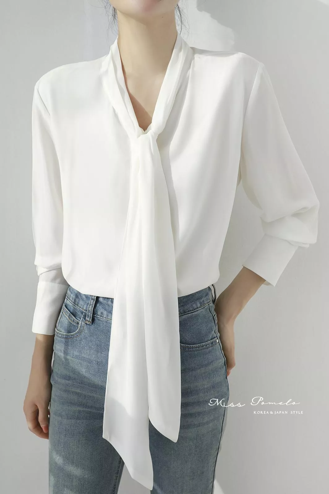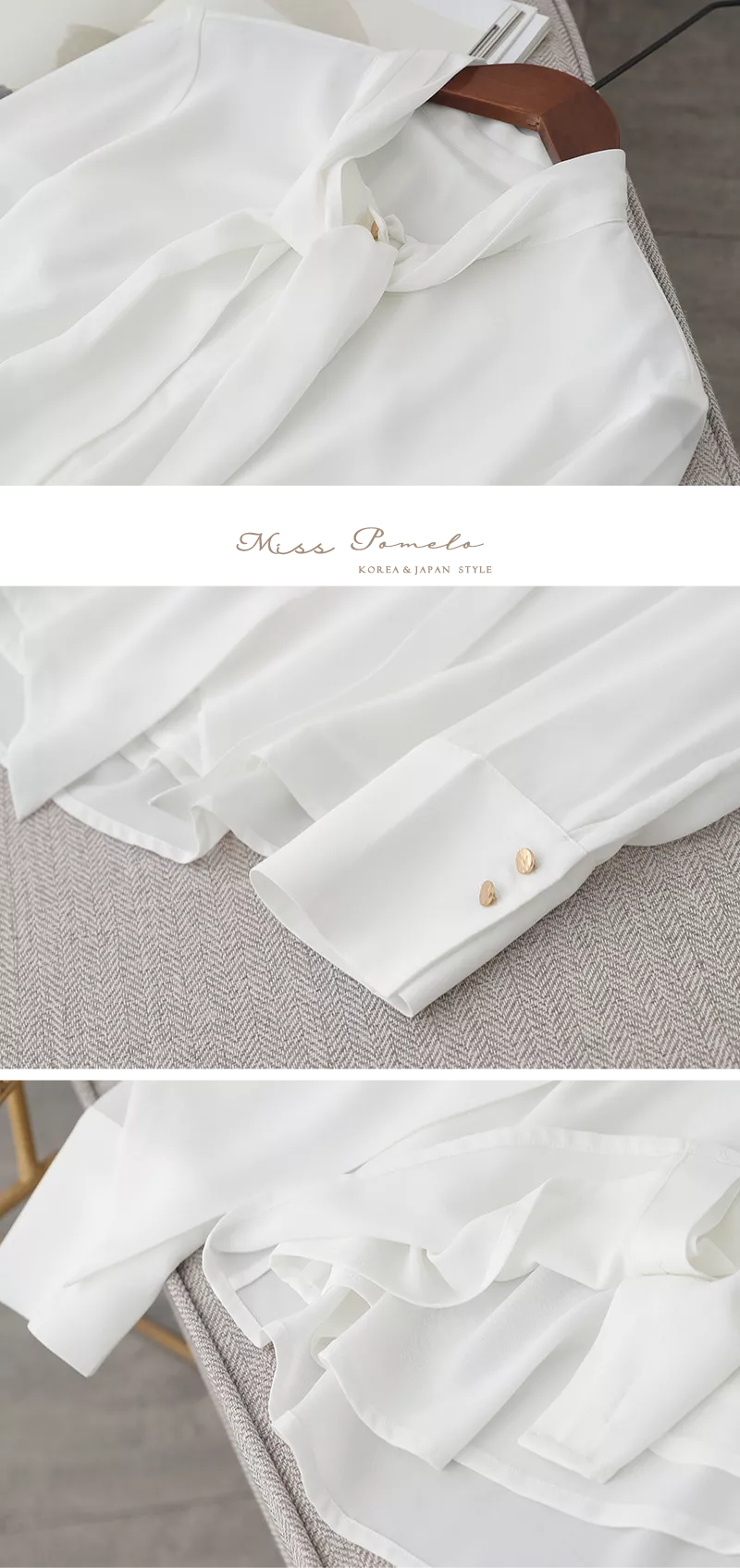 ● 領部以壓摺工藝細膩收邊,順延成柔長綁帶,可依心情繫成蝴蝶結或隨性垂落;