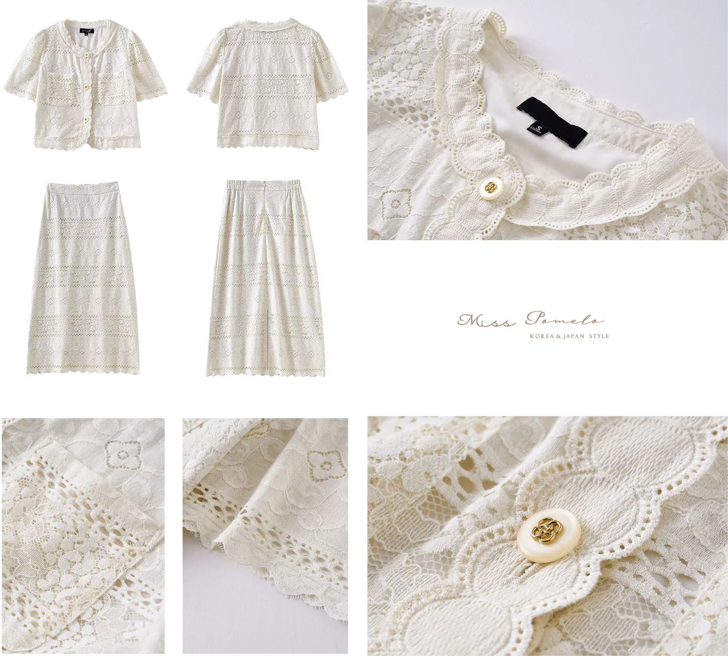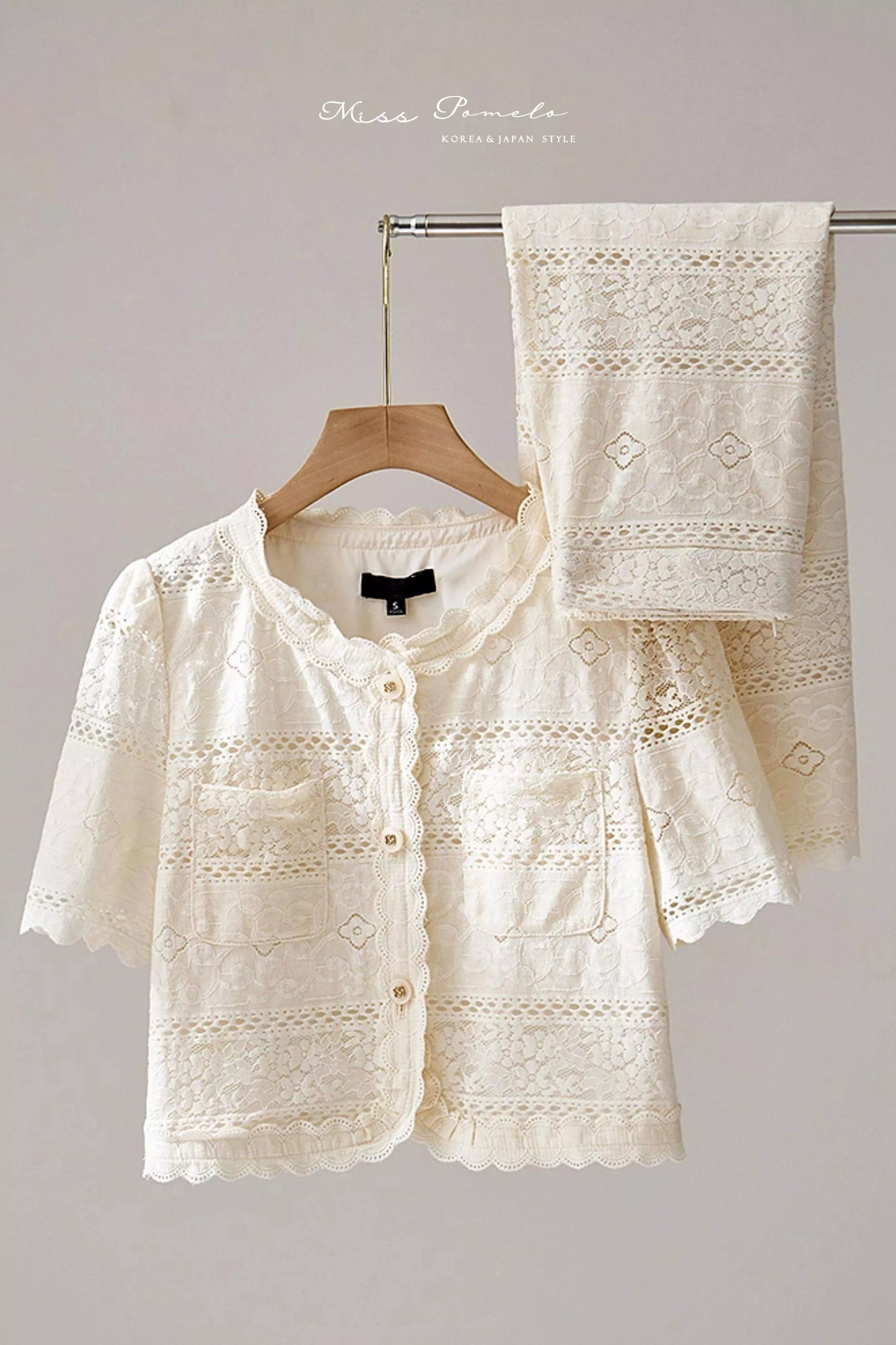 • 領口鏤空花邊蕾絲勾勒,柔美線條一路延伸至門襟與衣下擺,讓整體輪廓更顯精緻細膩。