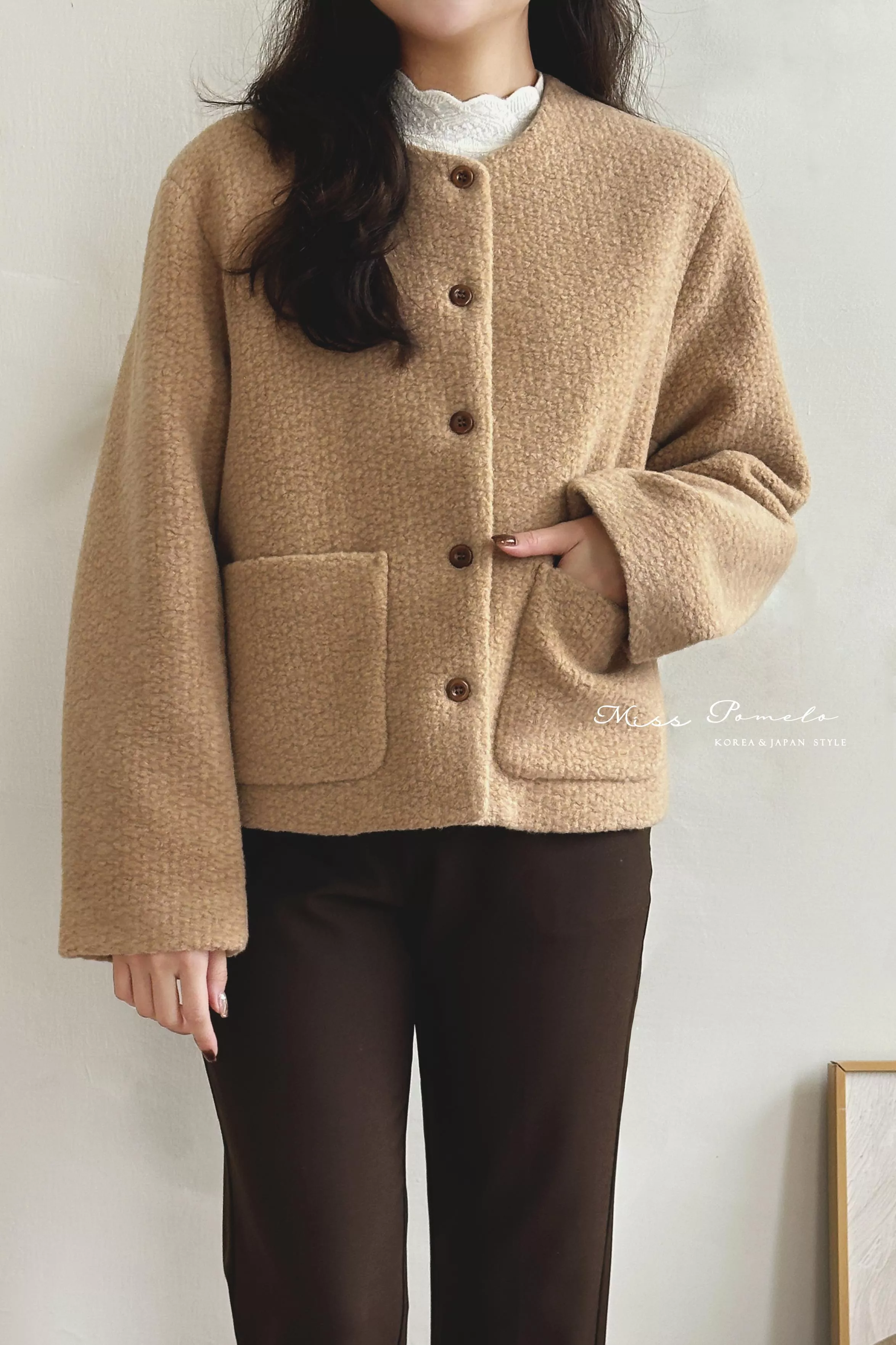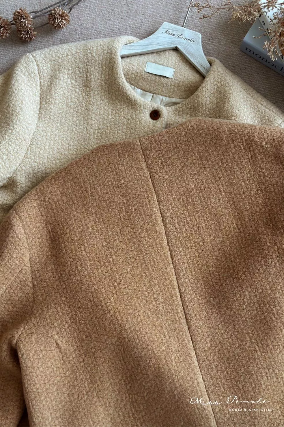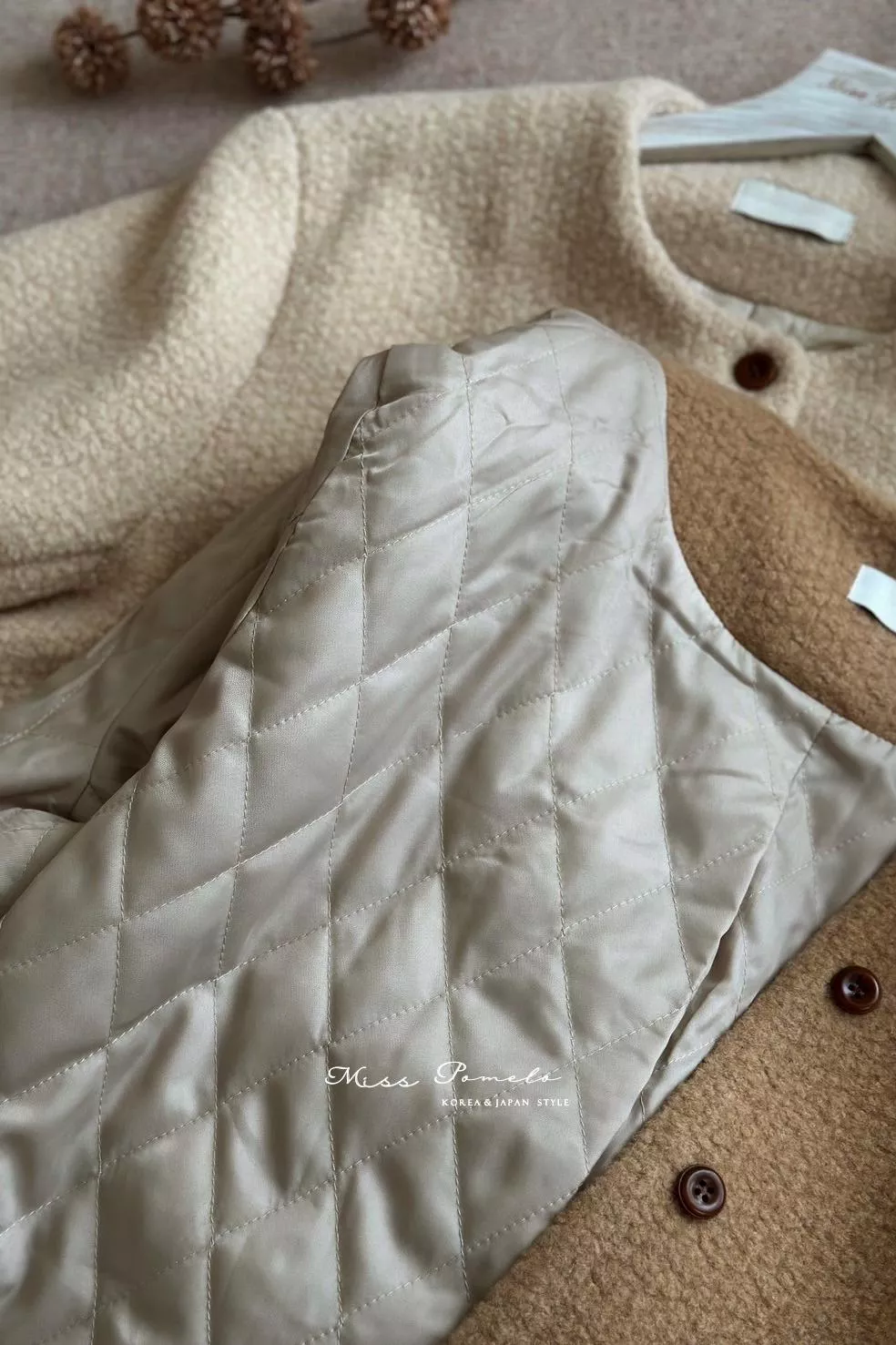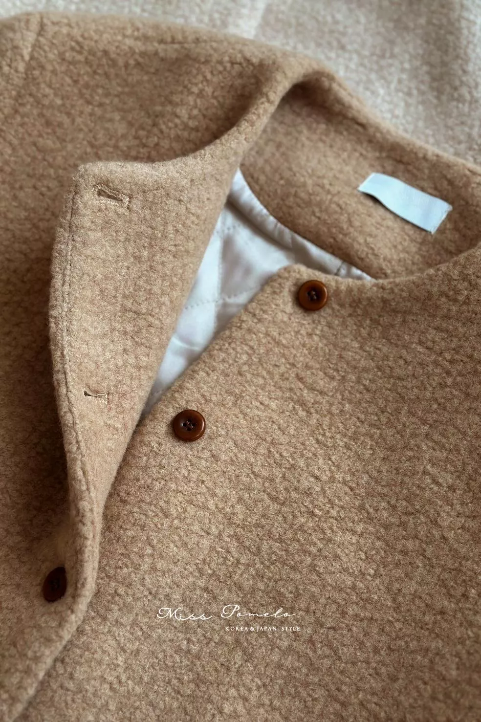 ● 精選羊毛呢混紡面料,布面帶立體團狀肌哩,視覺上有種羊羔絨毛既視感