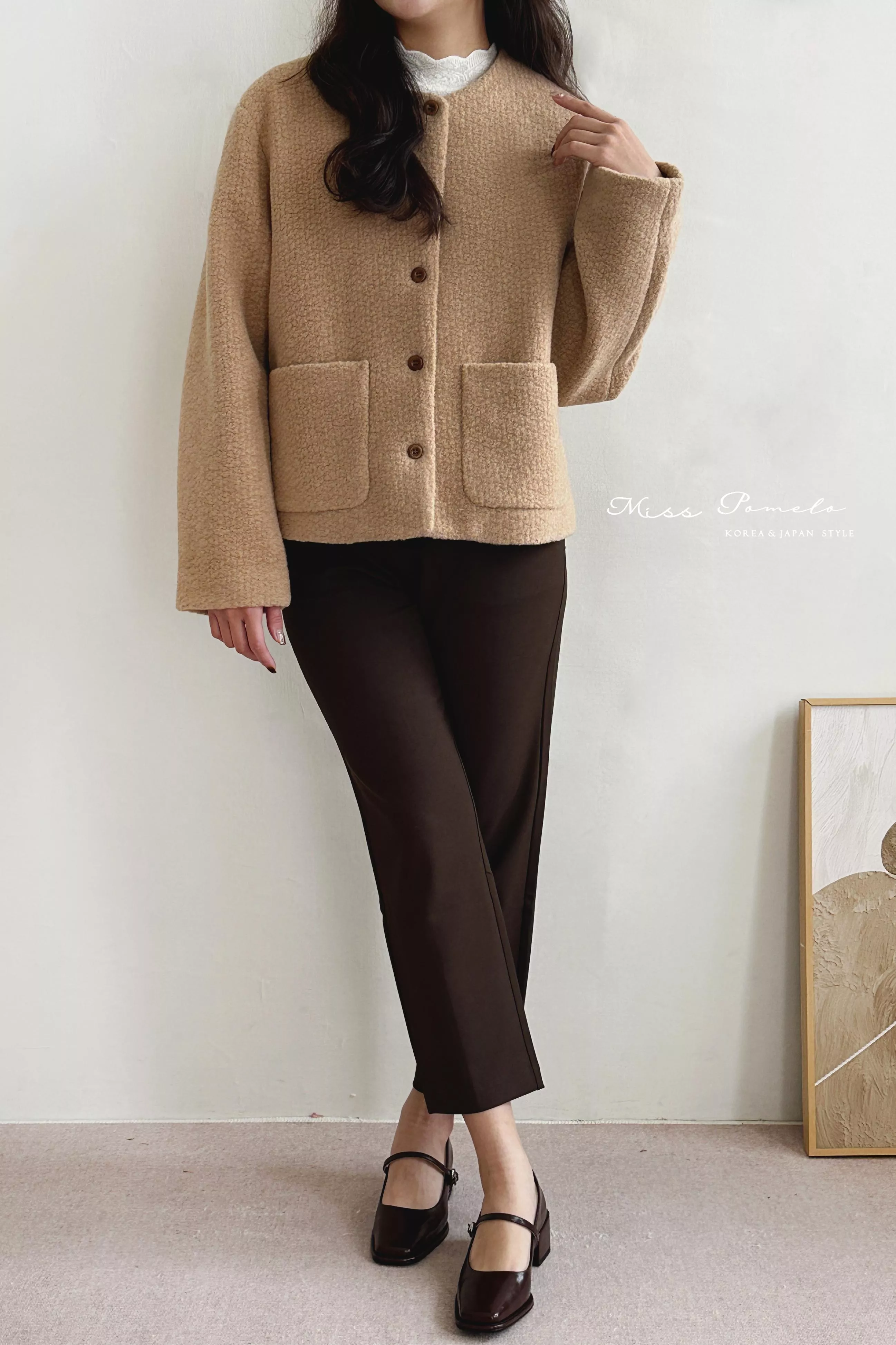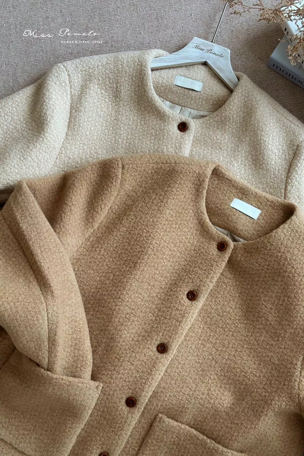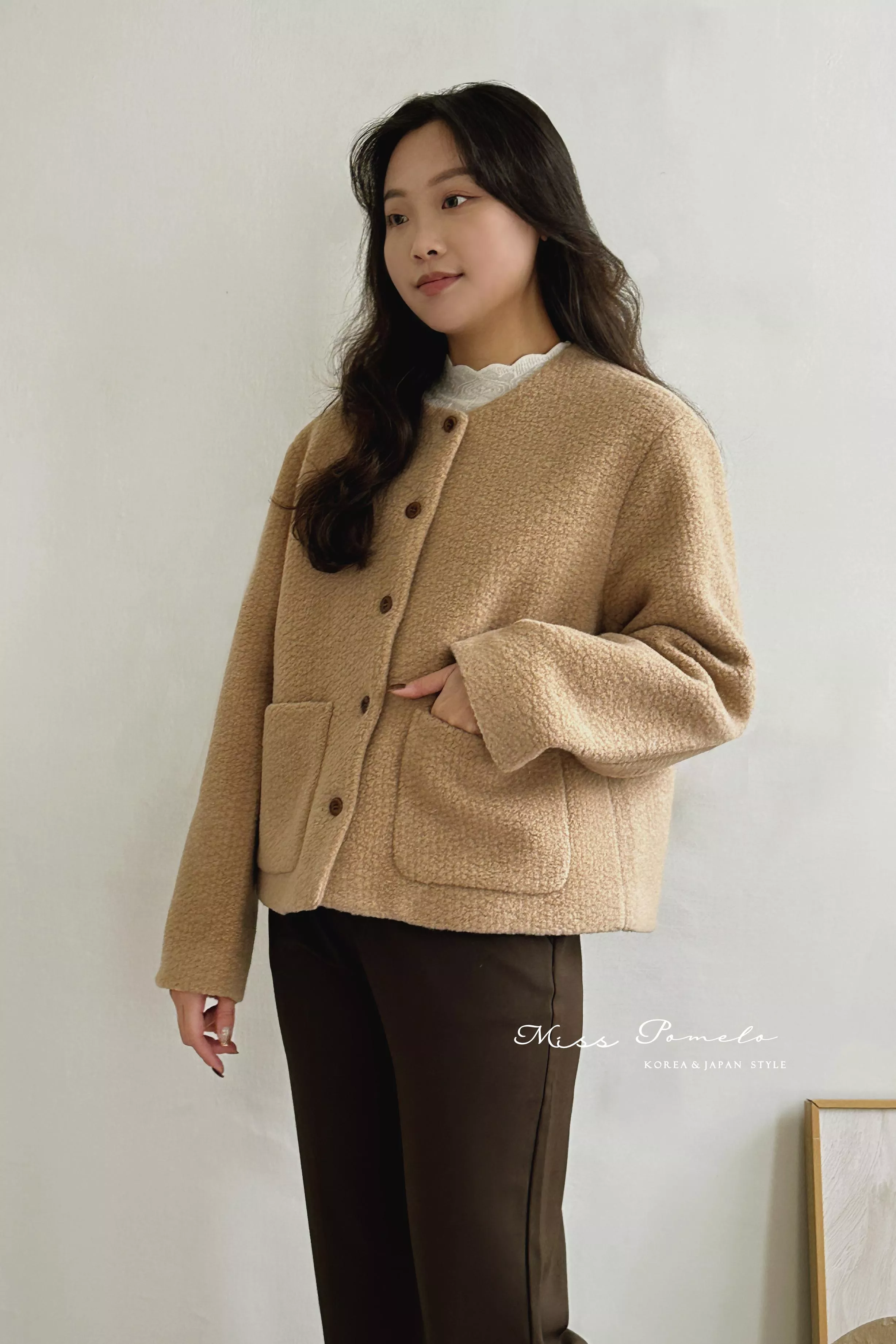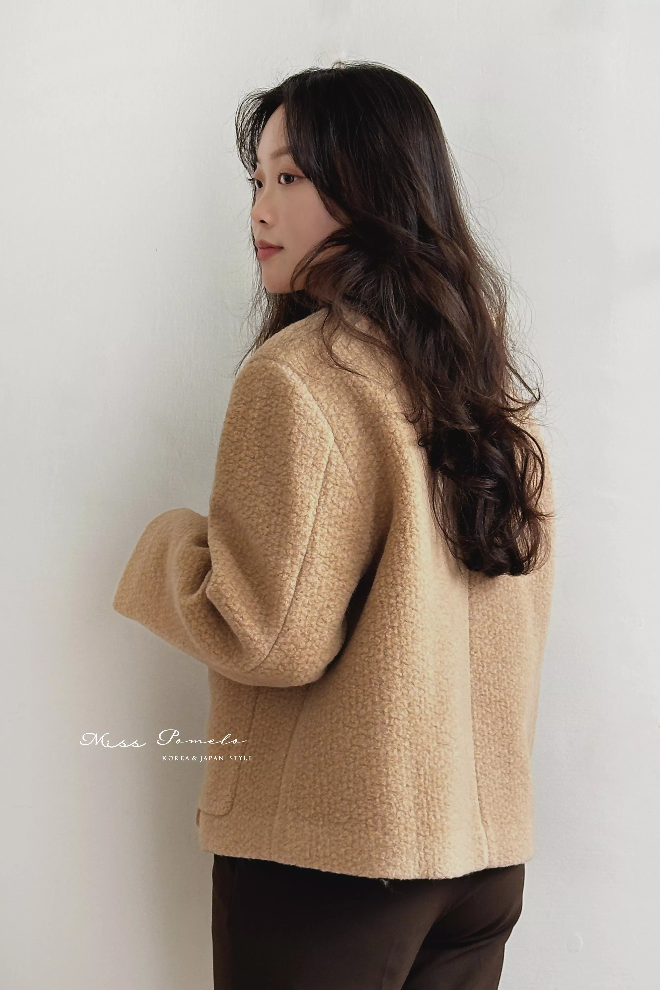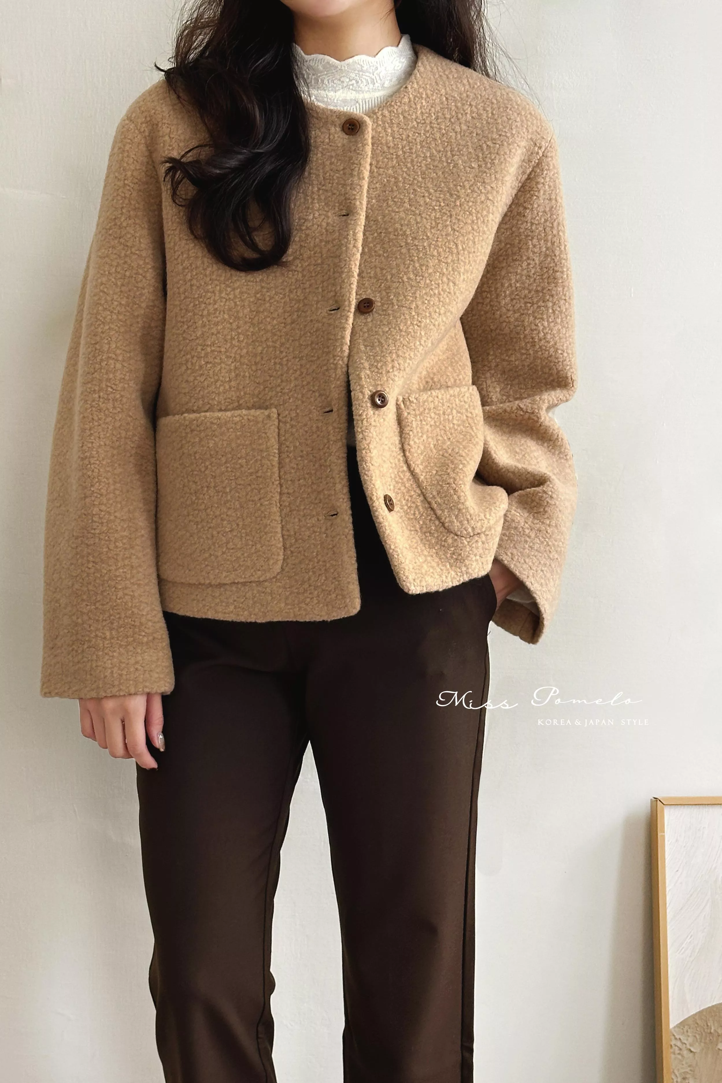 ● 精選羊毛呢混紡面料,布面帶立體團狀肌哩,視覺上有種羊羔絨毛既視感