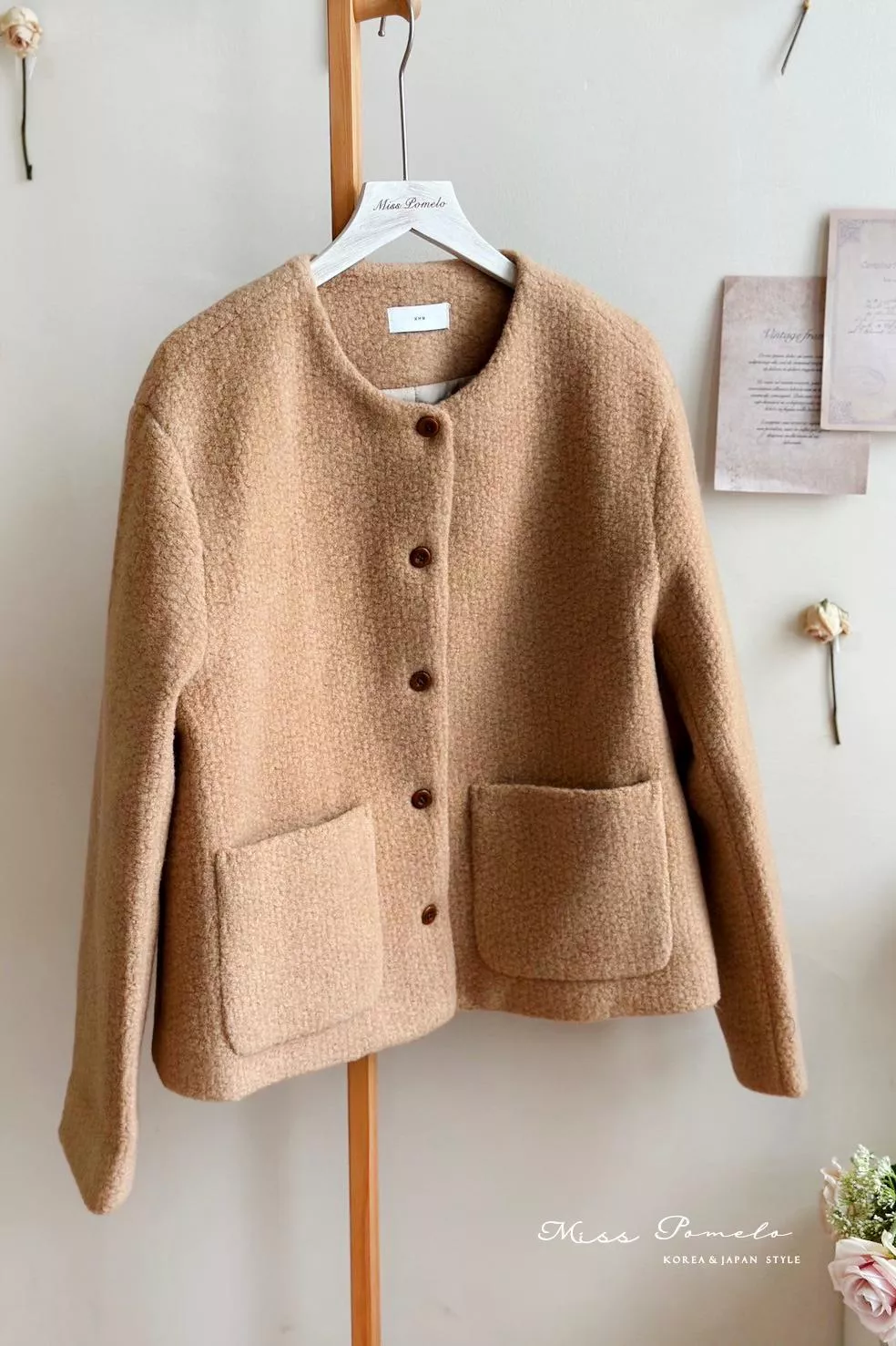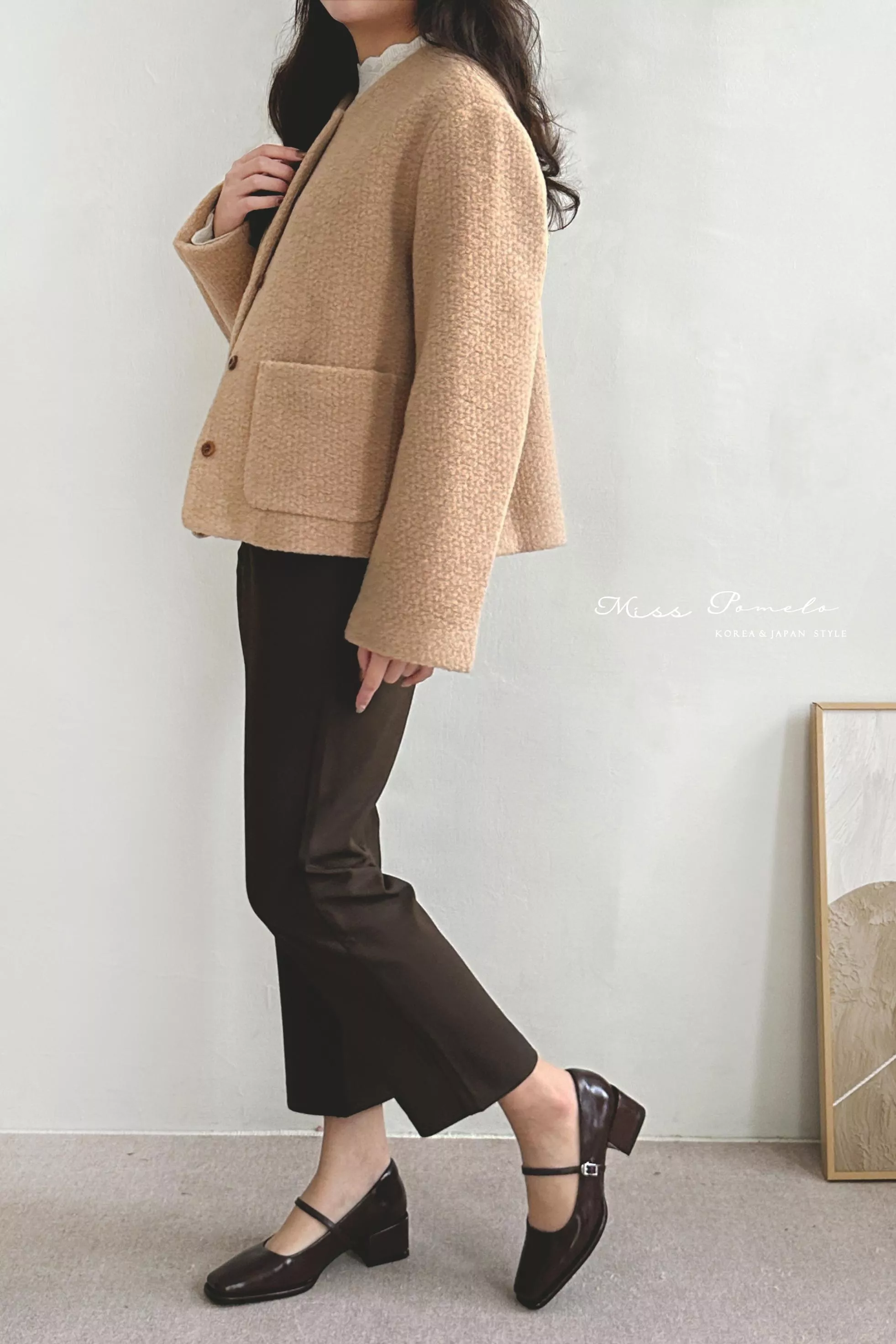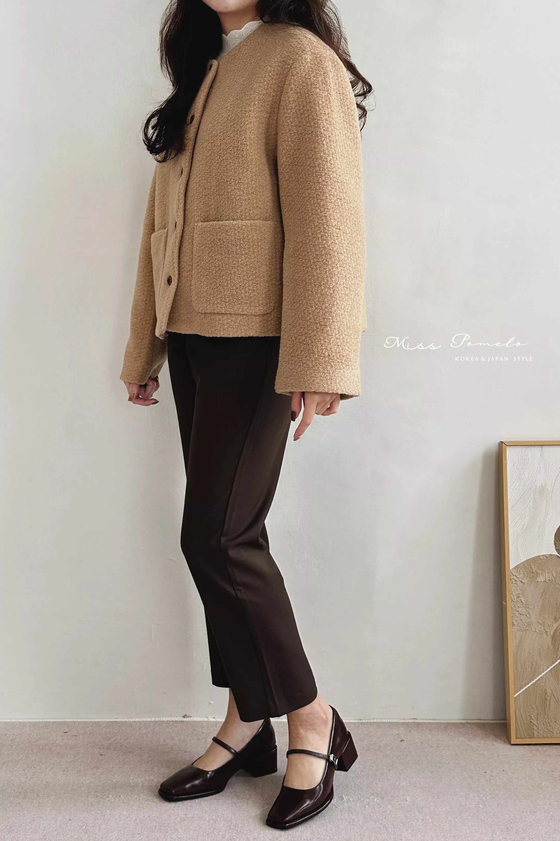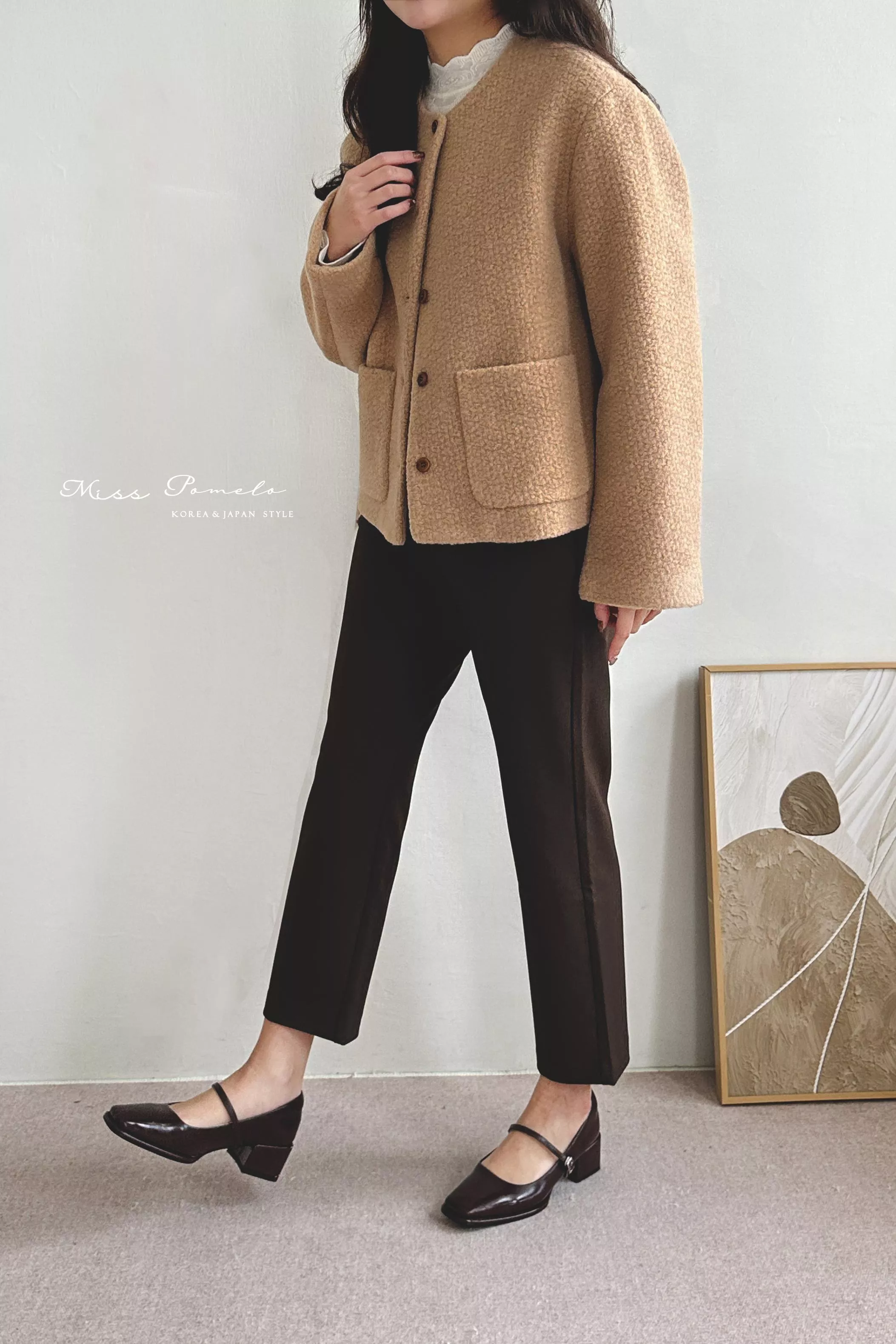 ● 精選羊毛呢混紡面料,布面帶立體團狀肌哩,視覺上有種羊羔絨毛既視感