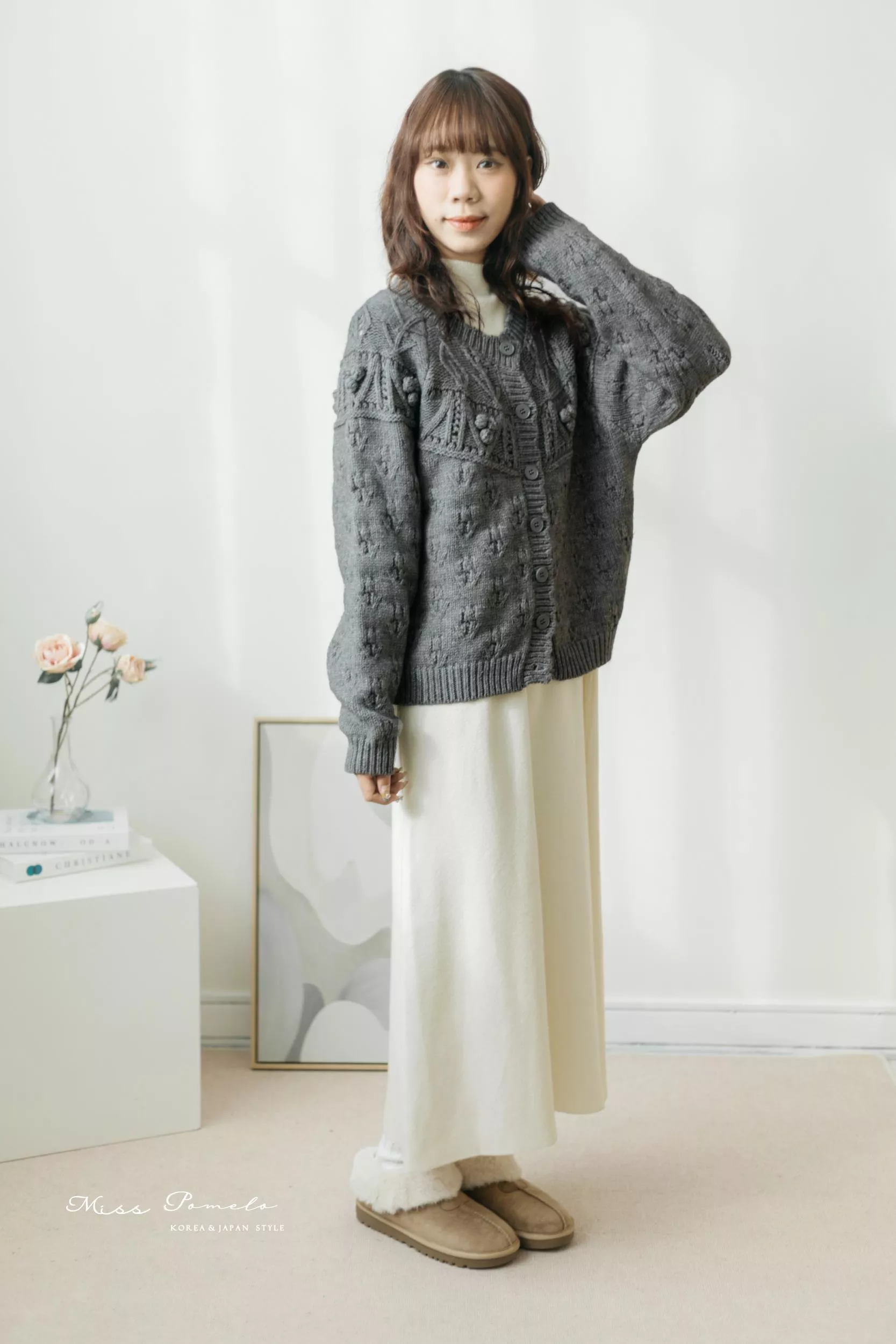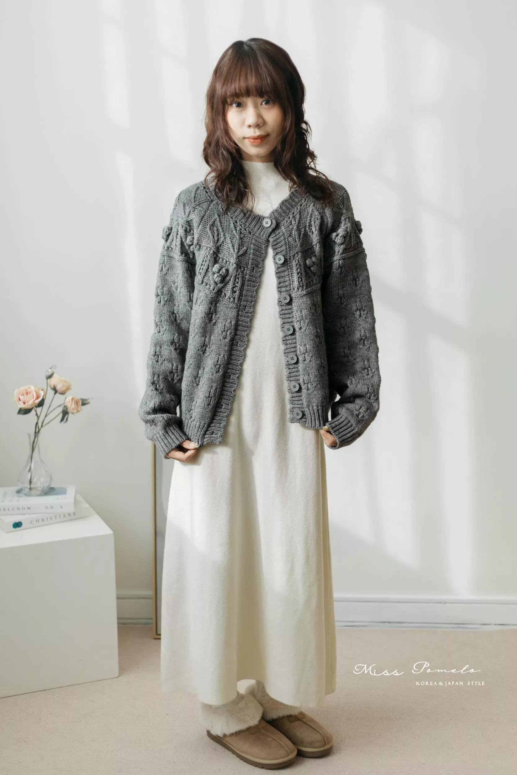 ● 胸口以「立體鑽石織紋+小花球球」堆疊,像冬日果園裡的果實結滿枝頭,手工感超強。