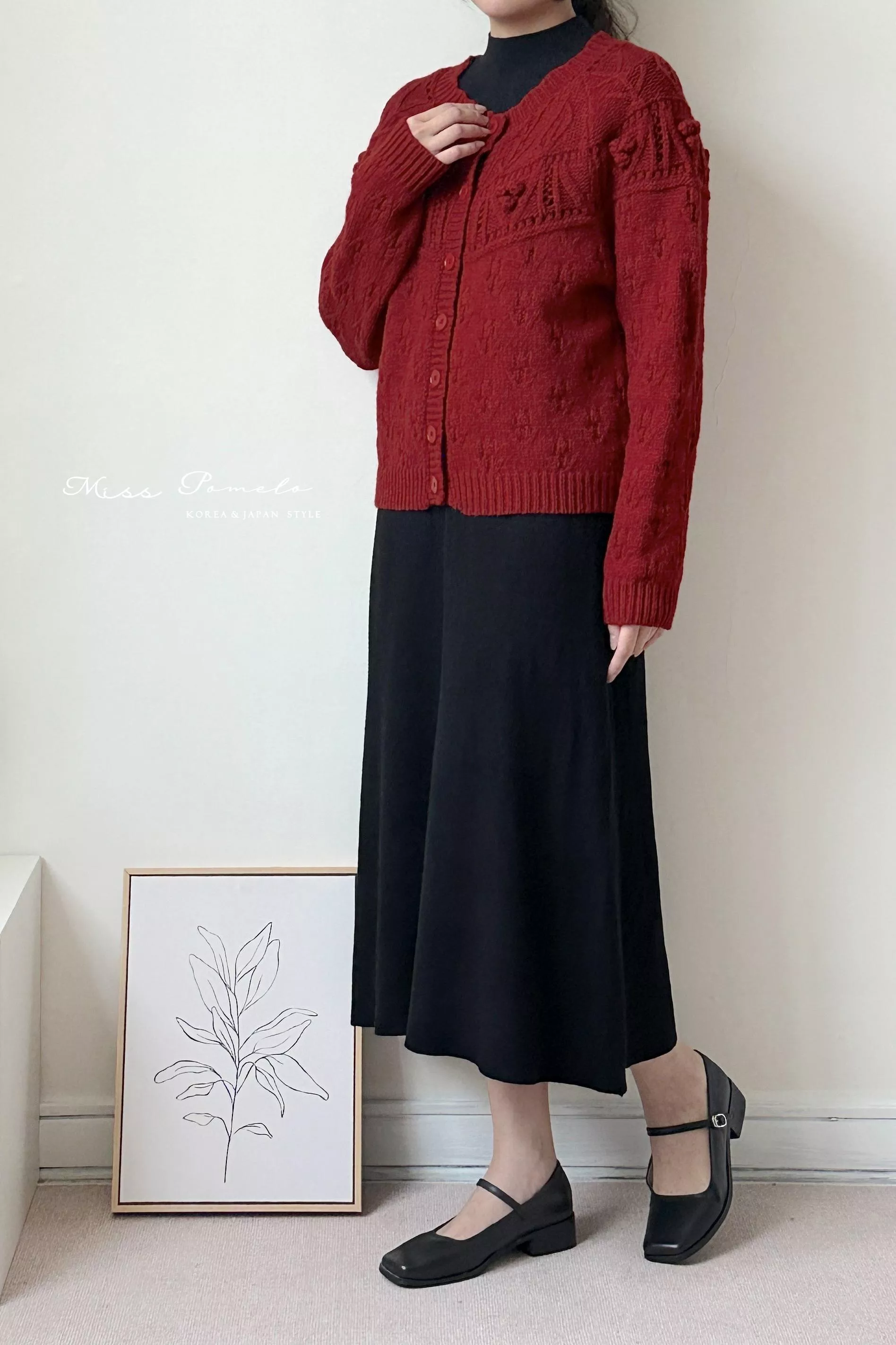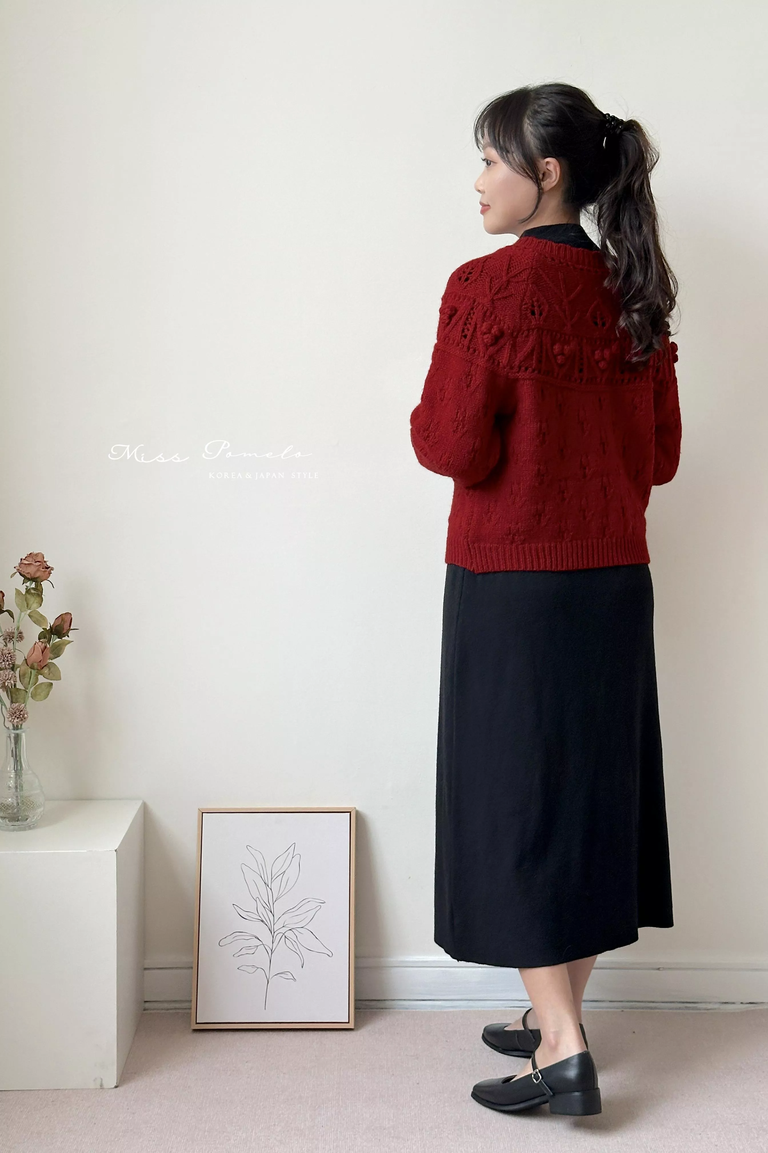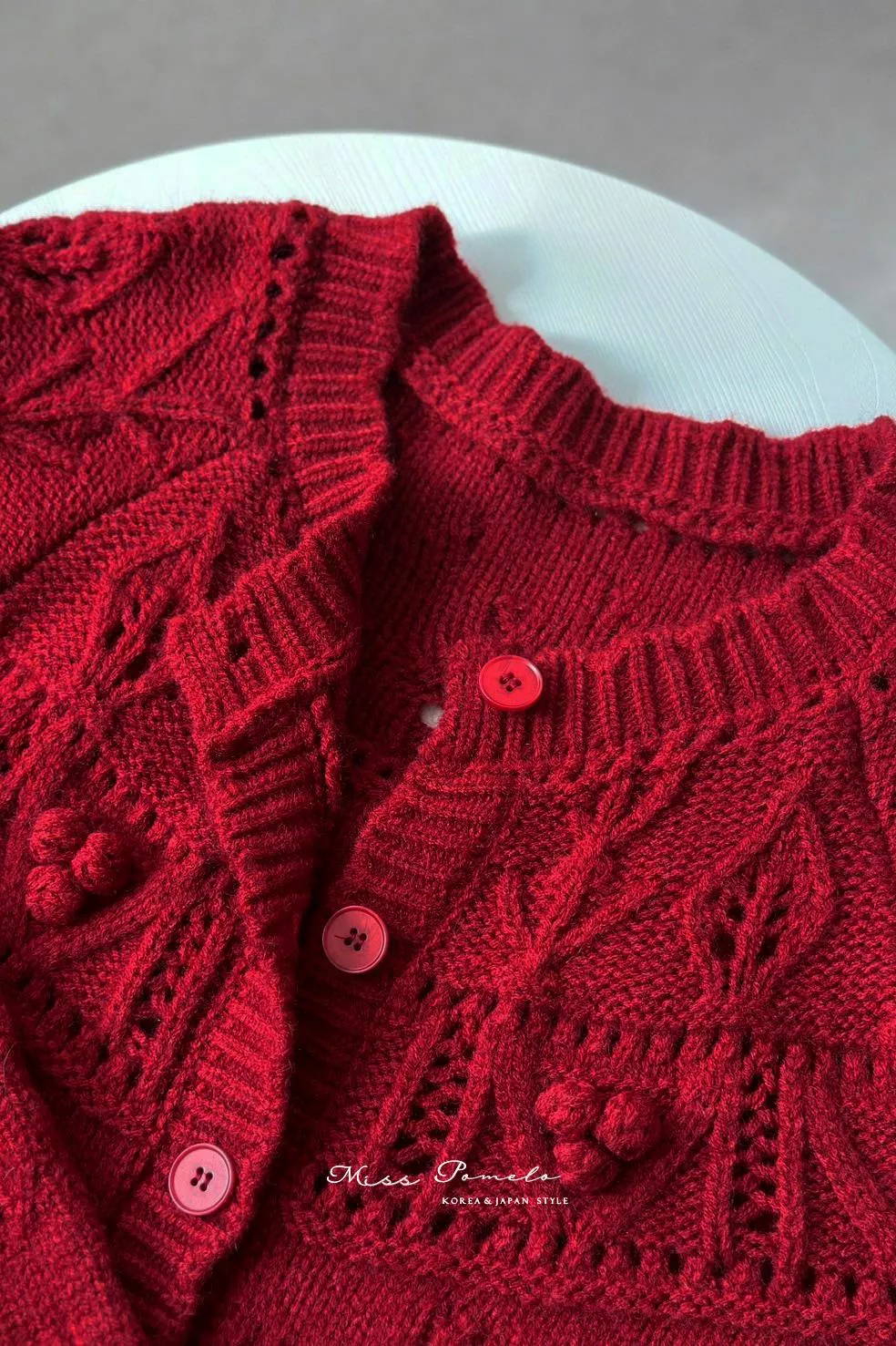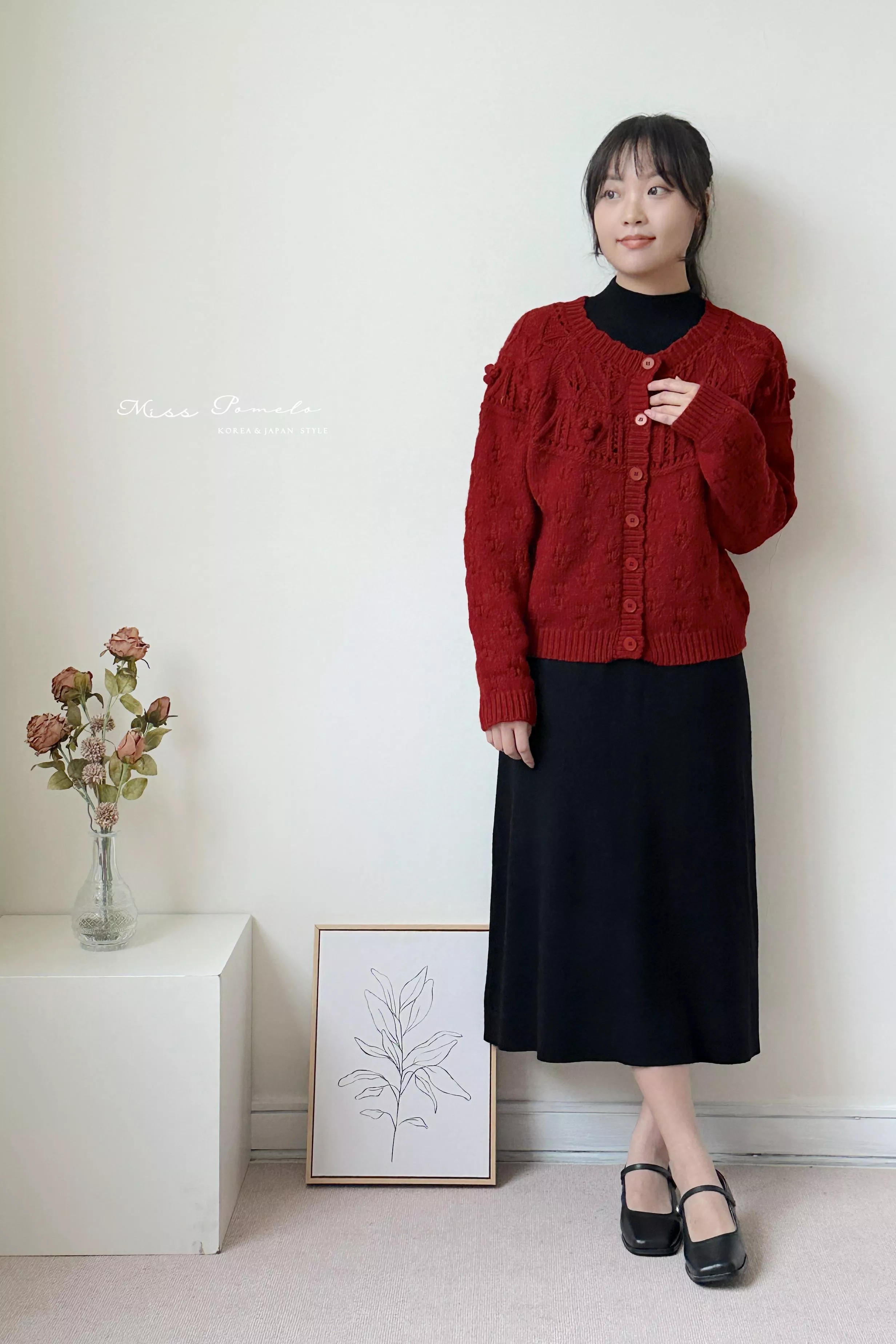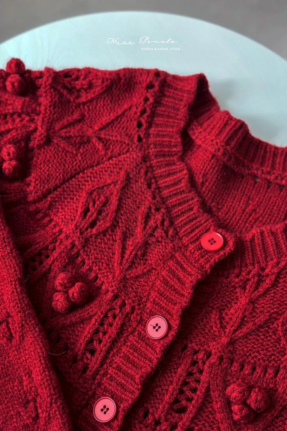 ● 胸口以「立體鑽石織紋+小花球球」堆疊,像冬日果園裡的果實結滿枝頭,手工感超強。