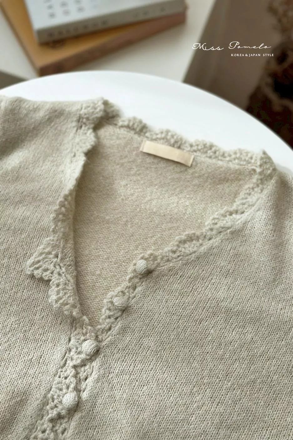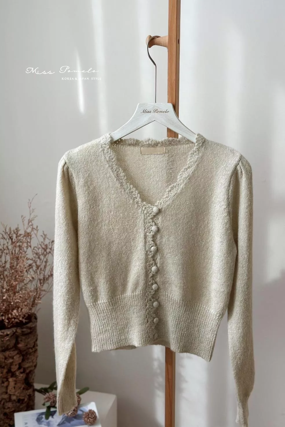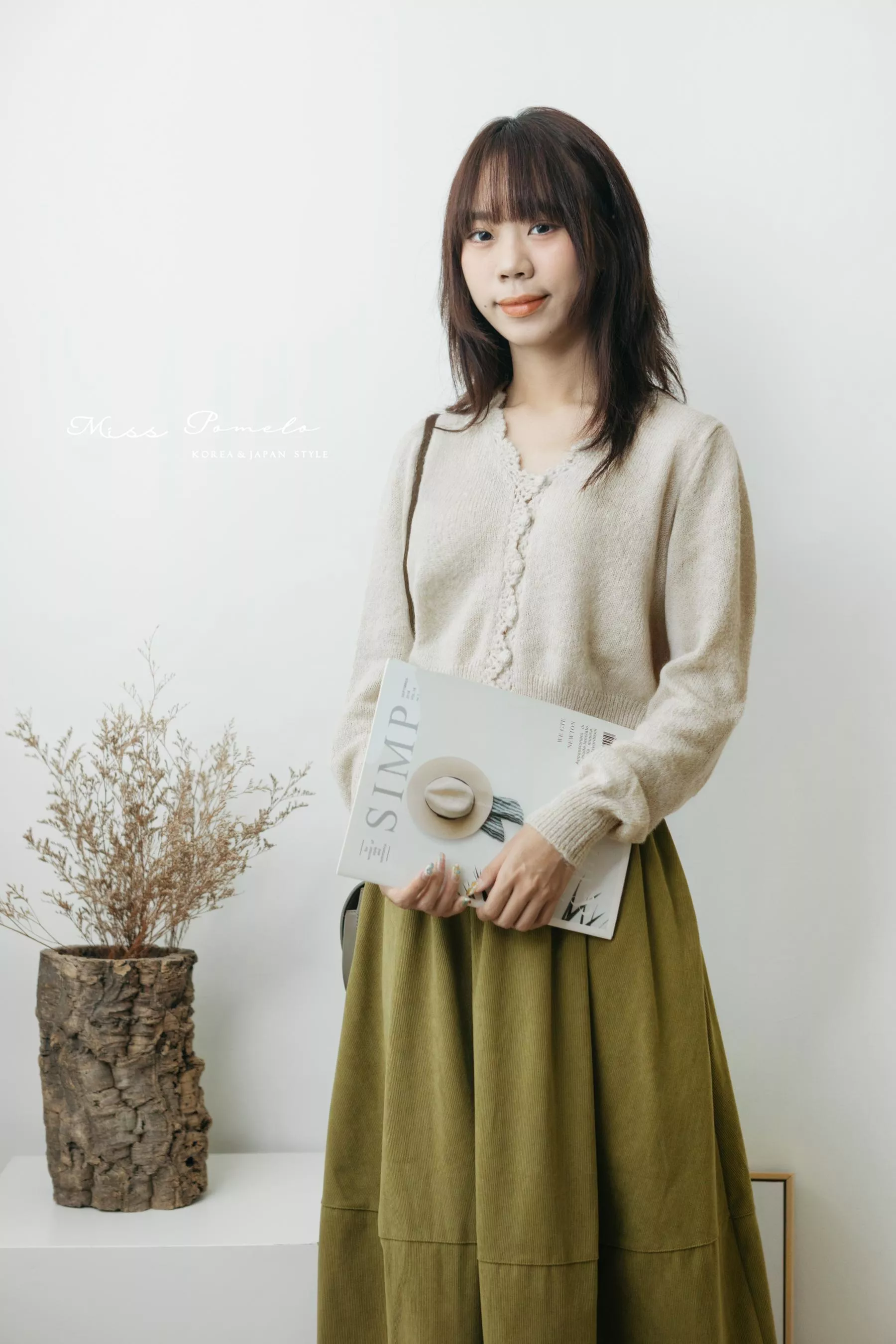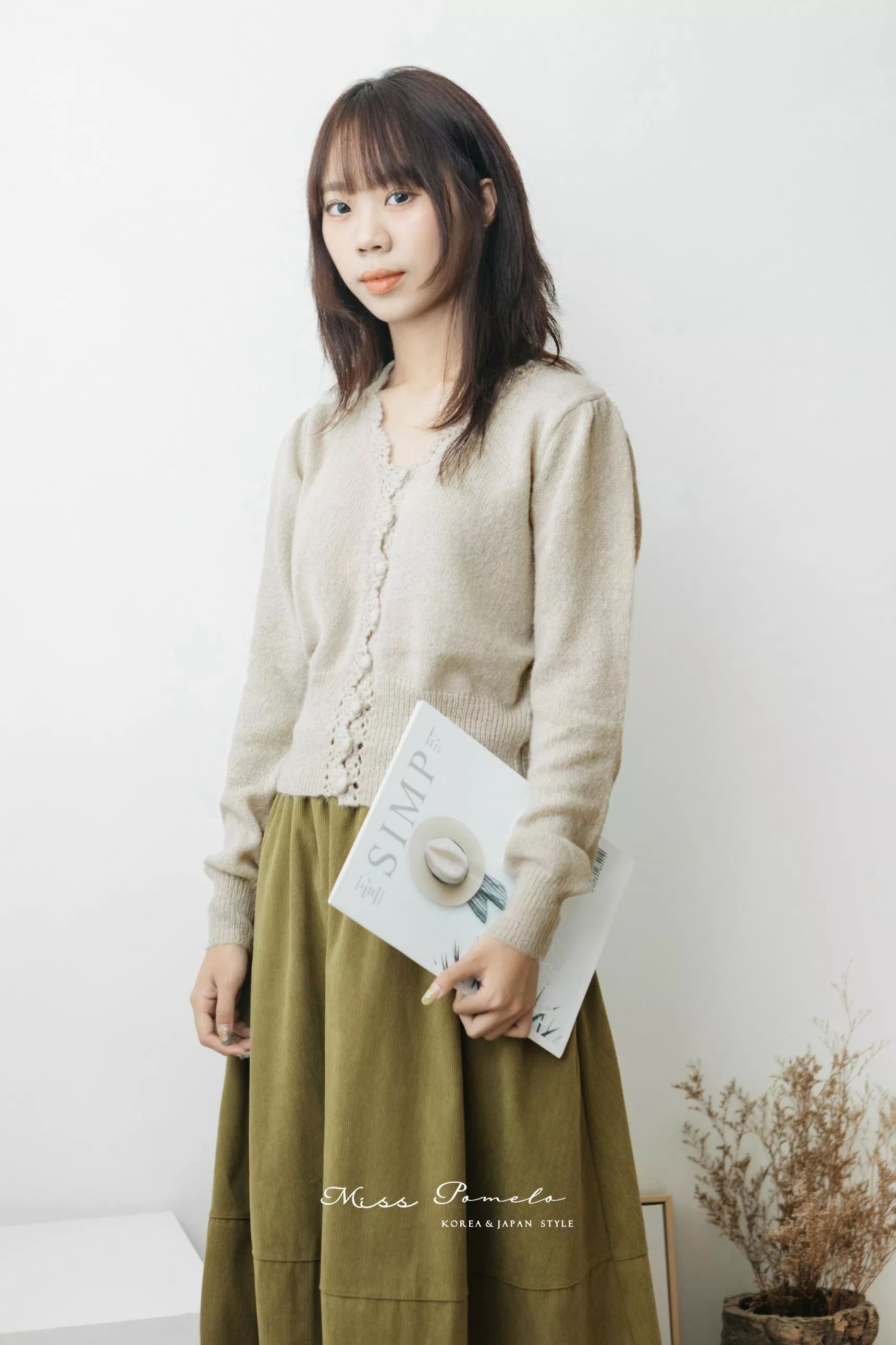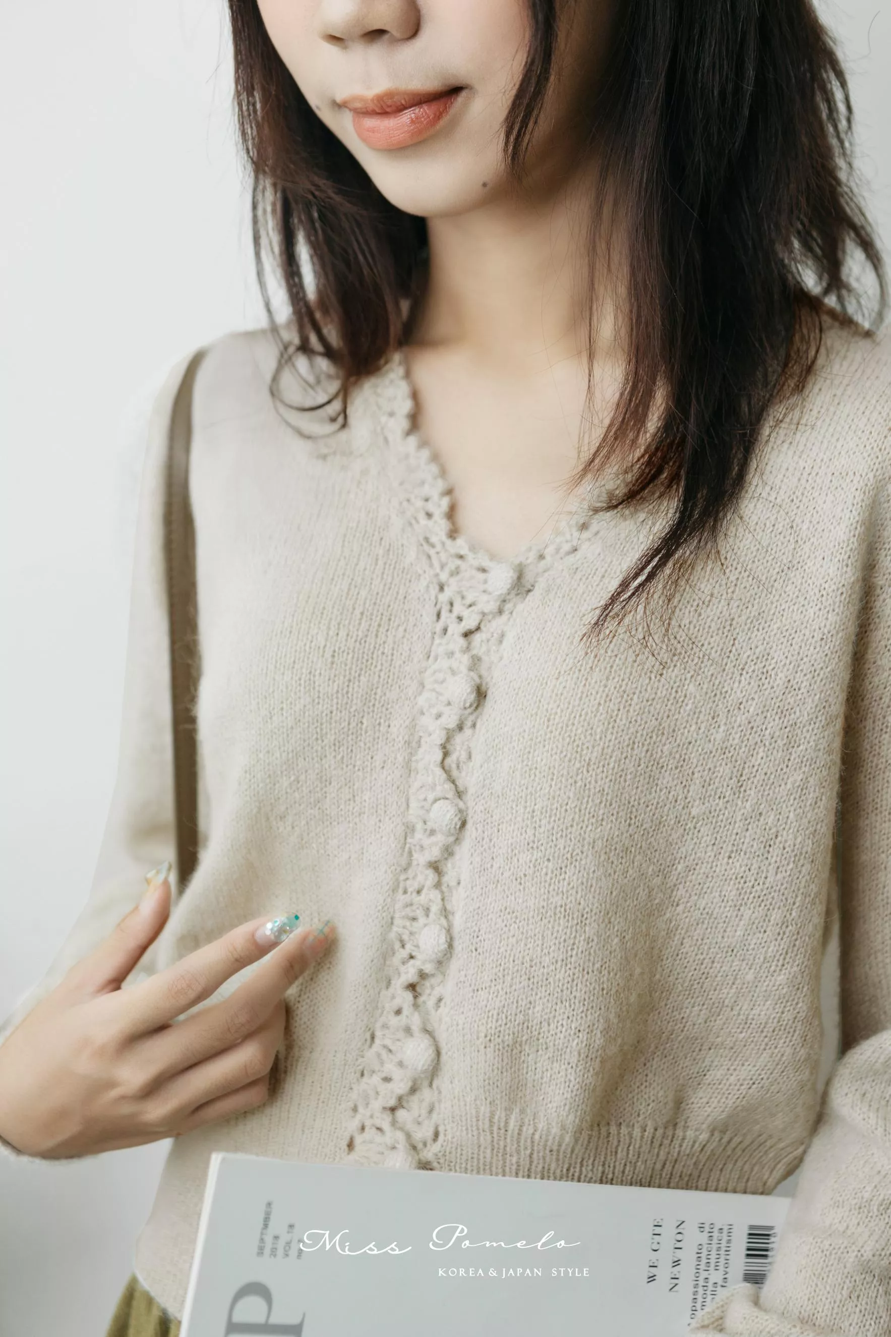 針織上衣|Lace Bloom。法式氣質V領鏤空花邊短版針織毛衣